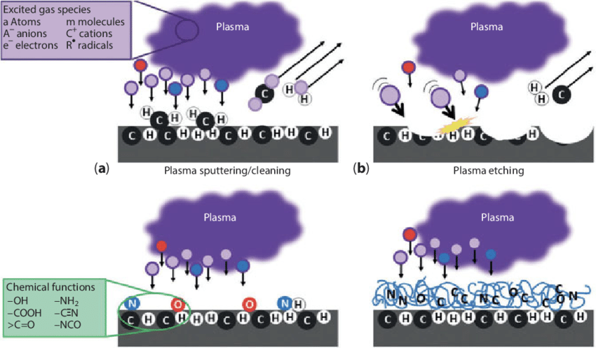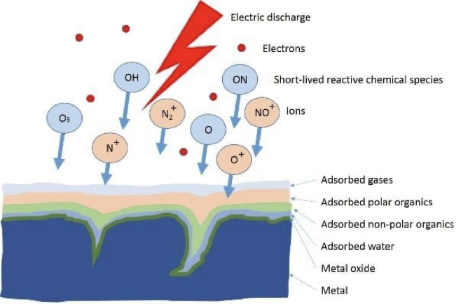 Физически механизм очистки заключается в следующем. В плазме атомы газа переходят в более высокие энергетические состояния, а также ионизируются. Плазма разряда включает: атомы, молекулы, ионы, электроны, свободные радикалы, метастабильные вещества и фотоны в коротковолновом ультрафиолетовом диапазоне. Эта смесь затем взаимодействует с любой поверхностью, помещенной в плазму.